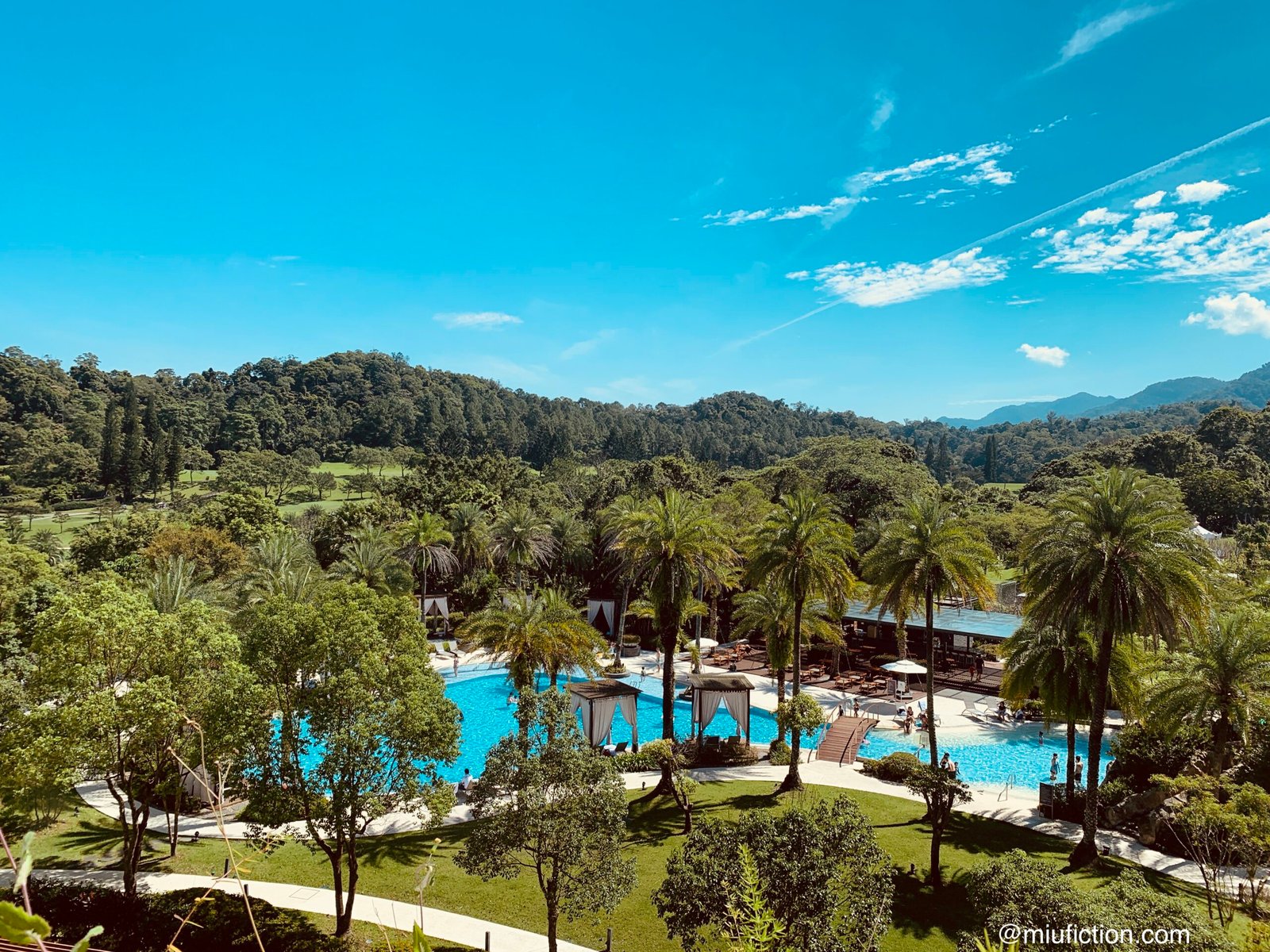 陽台景觀面向高爾夫球場的一片綠地,而非游泳池,遠離泳池畔遊客玩樂的喧囂。